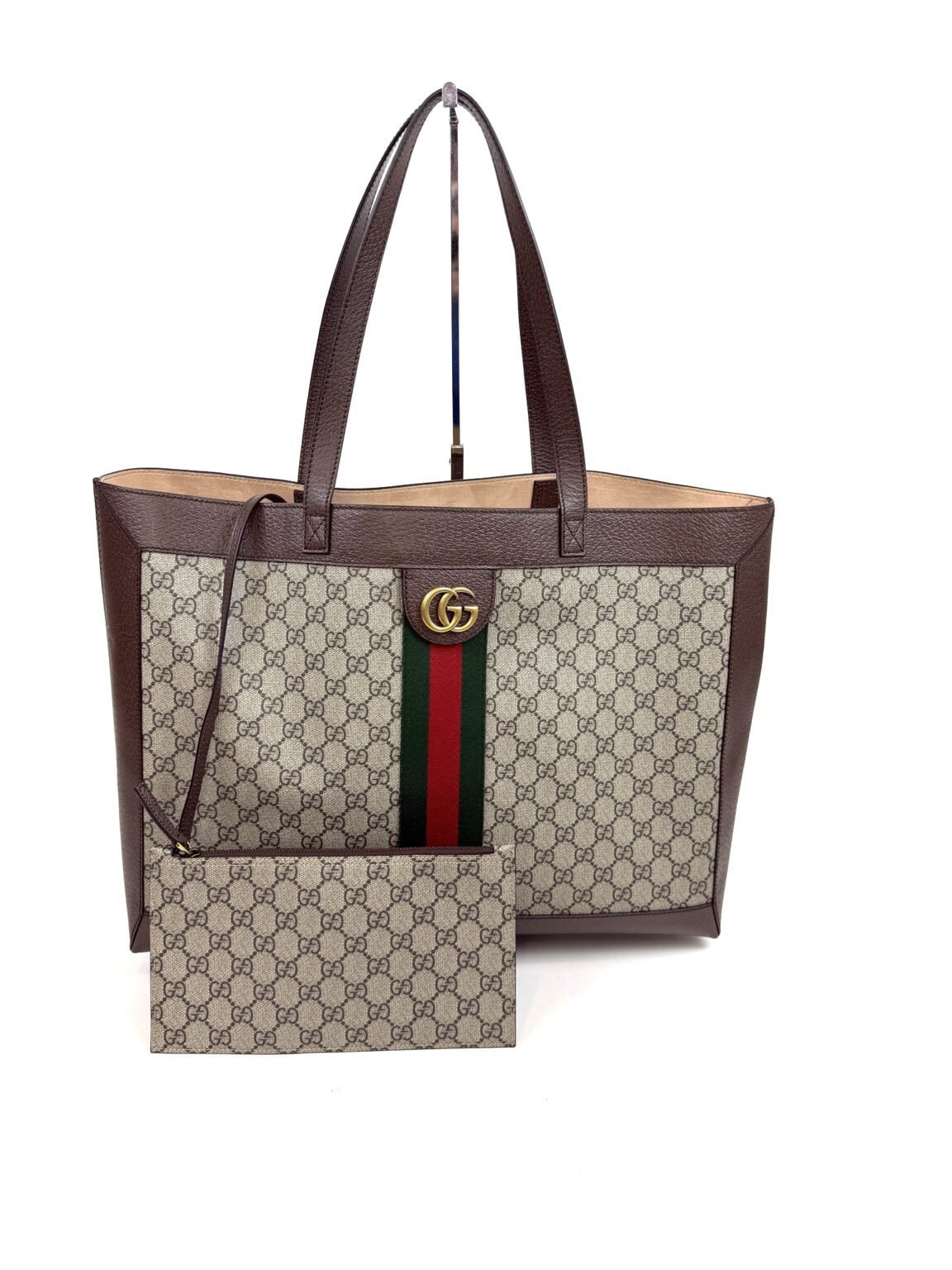 This tote is crafted of monogram coated canvas with brown leather trim. The bag features brown leather shoulder straps, a green and red web stripe down the center, and aged gold hardware. The top is open to a beige microfiber interior with a removable zipper pouch.