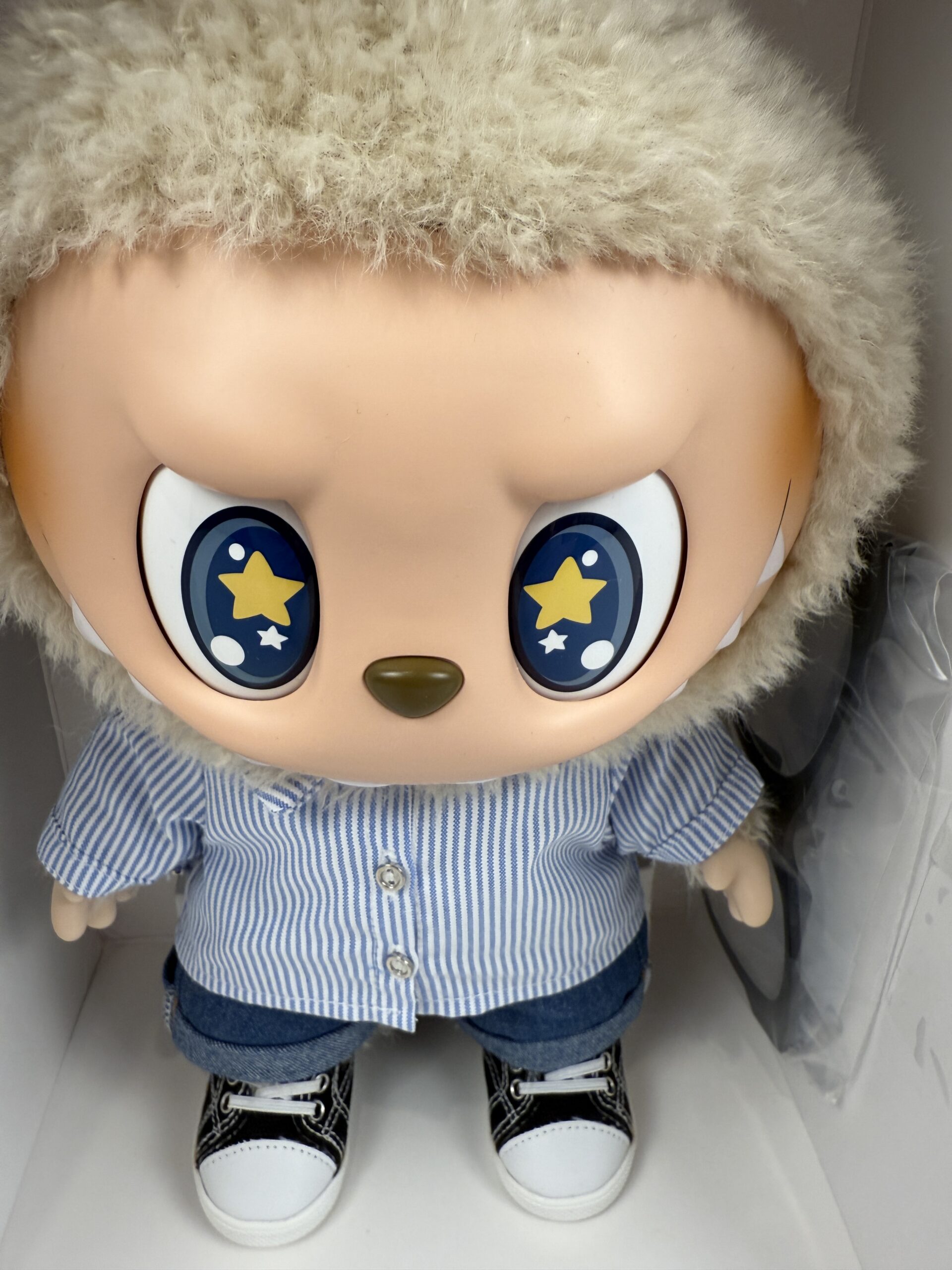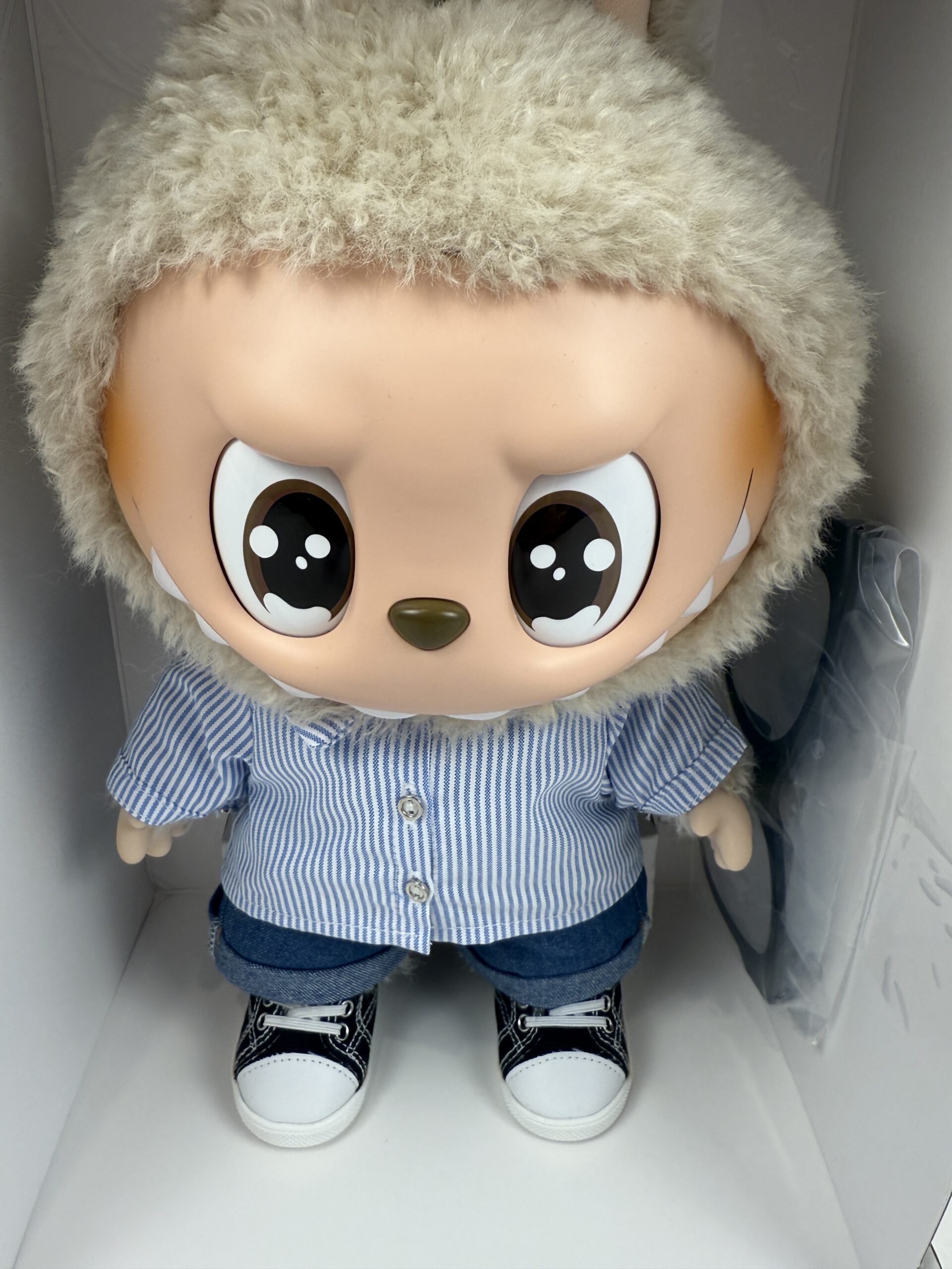 Retired and high demand item ! Material: SHELL: 40% COTTON,17%PVC,16% POLYESTER, 15%ABS, 12%TPRSTUFFING: 90% POLYESTER, 10% PE PARTICLES Height: 20*15*40CM/7.87*5.91*15.75 INCHES The eyes move and change to 4 different colors Brand new in box 15.75" tall The small labubu is for size comparision only, it is not included.