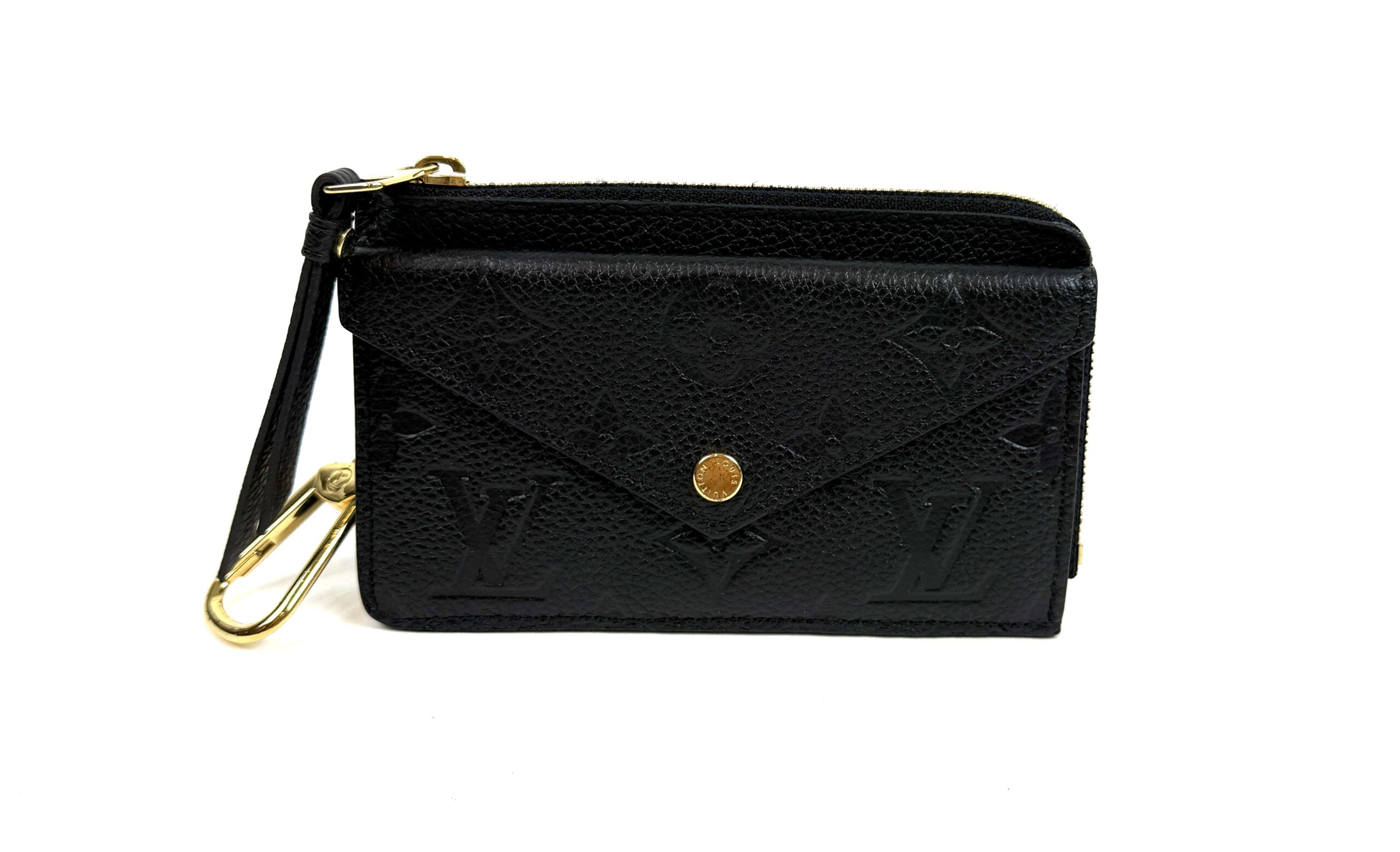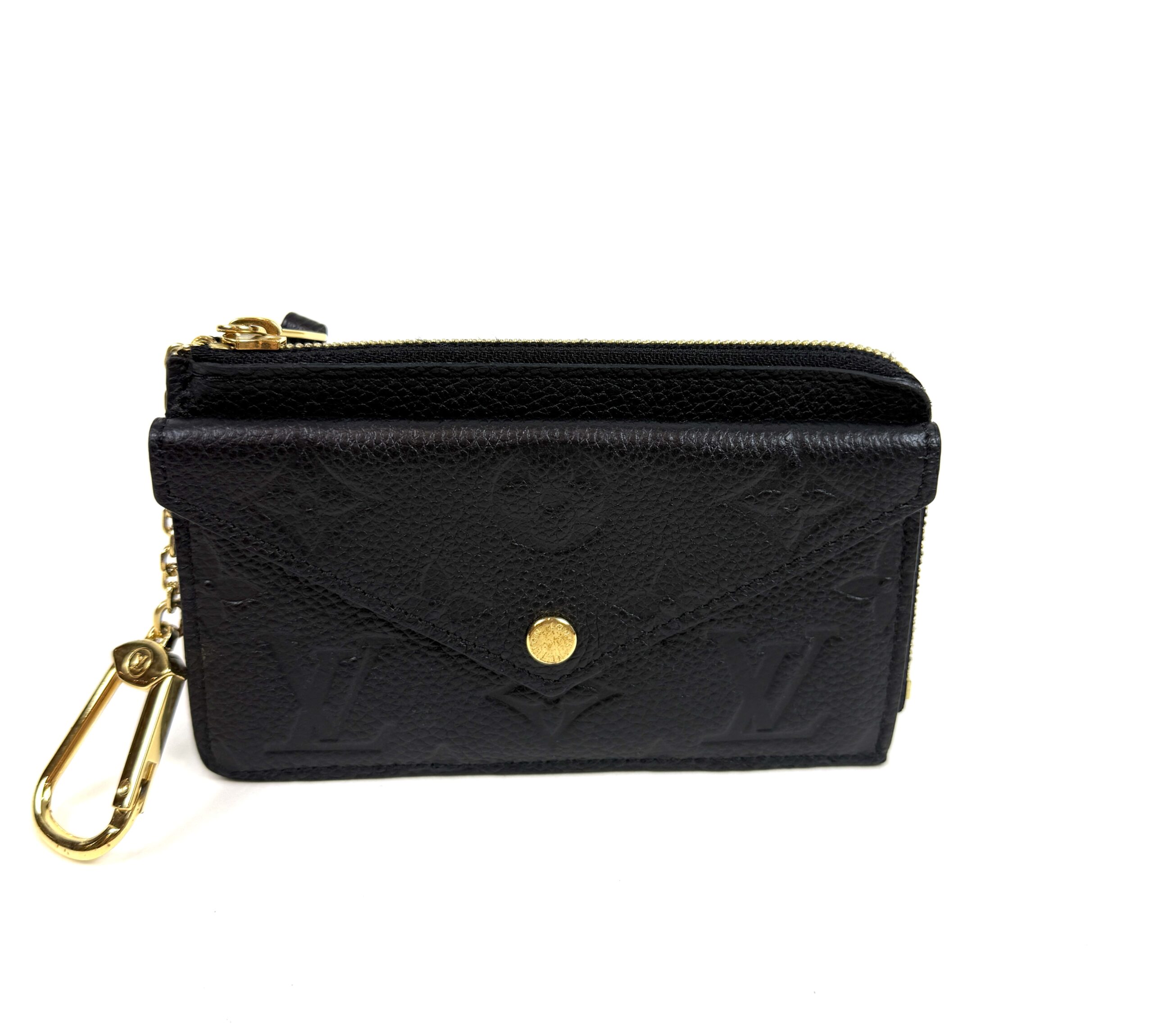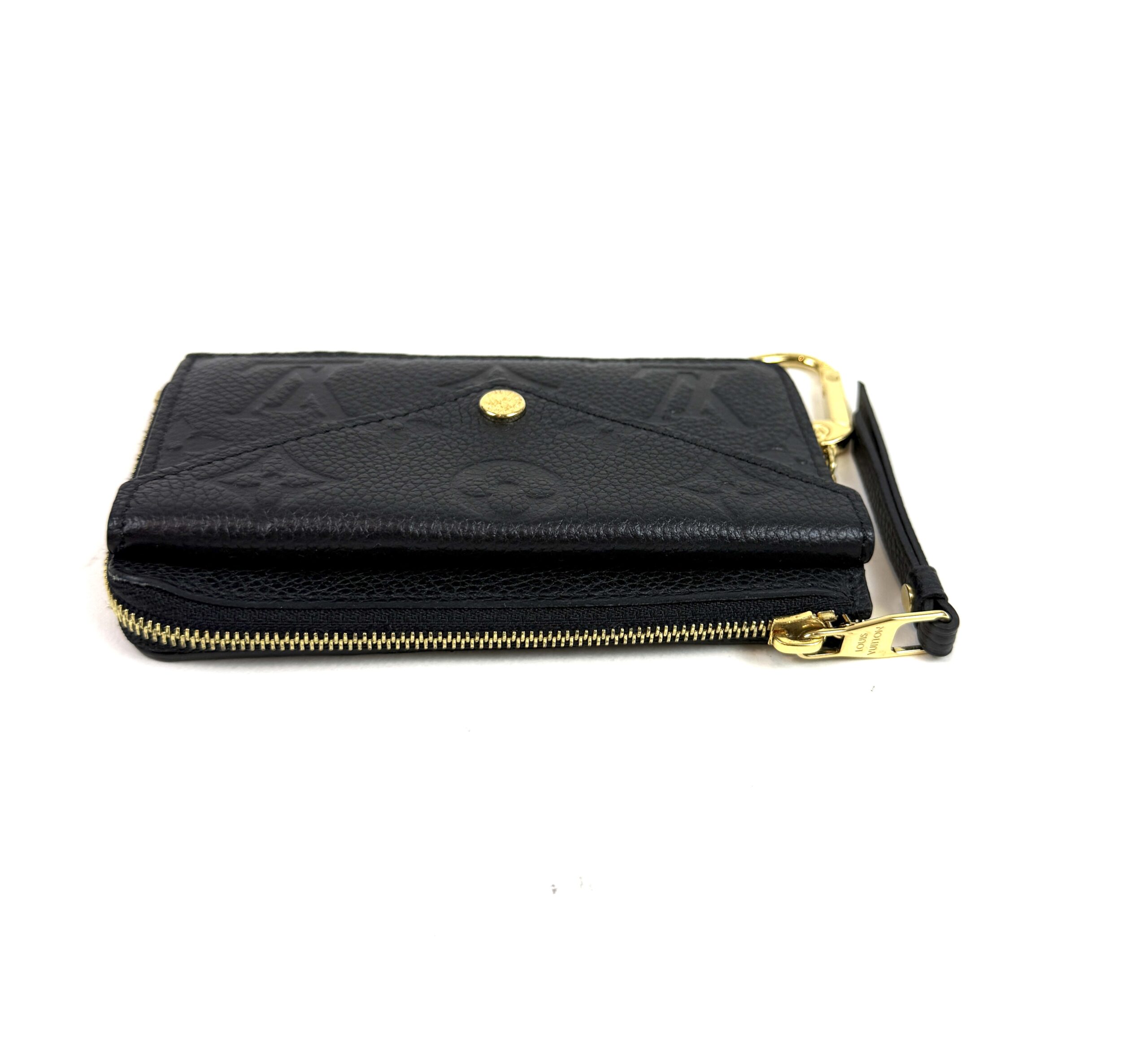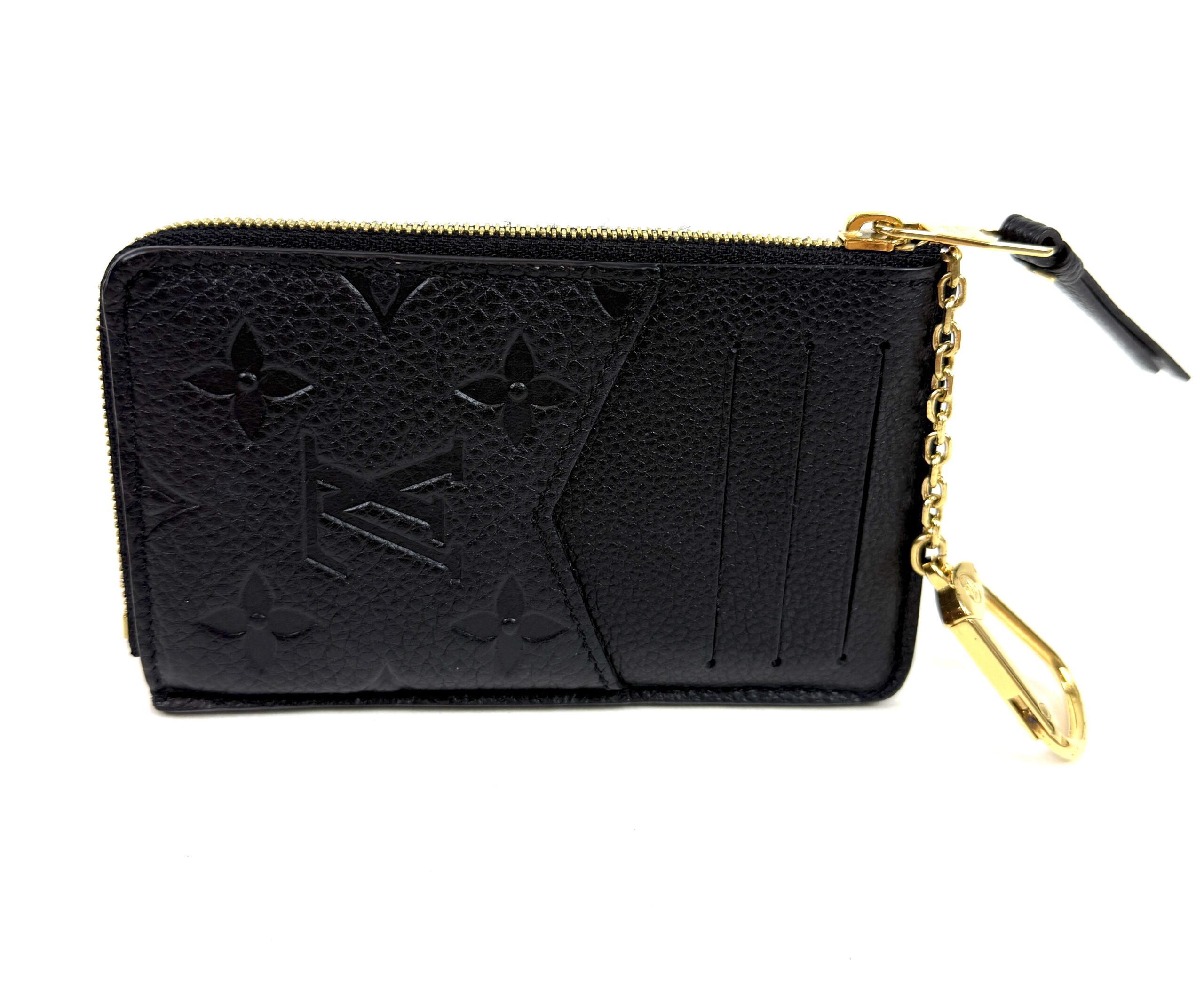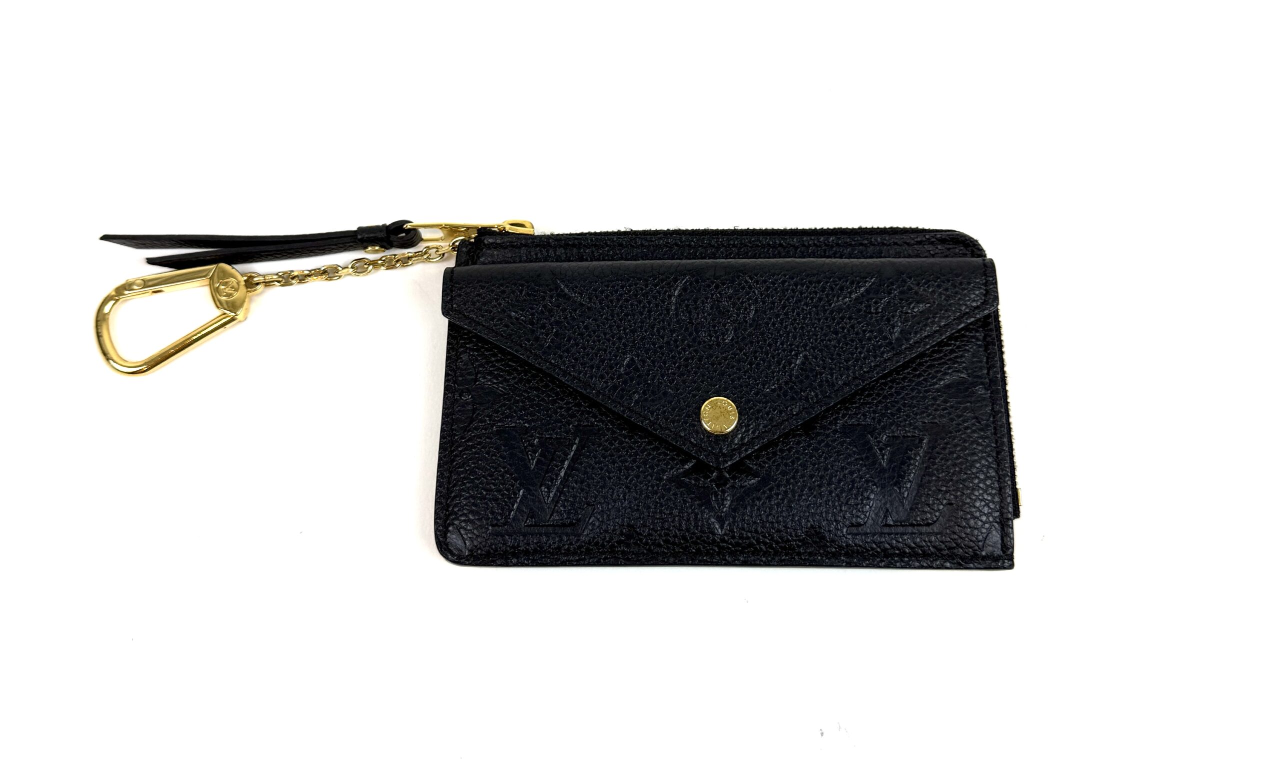 This very chic cardholder is finely crafted of Louis Vuitton monogram-embossed leather in black. The case features a front envelope pocket, card slots on the back, and a zipper currency compartment with a key ring clasp. Retail plus tax is $888!