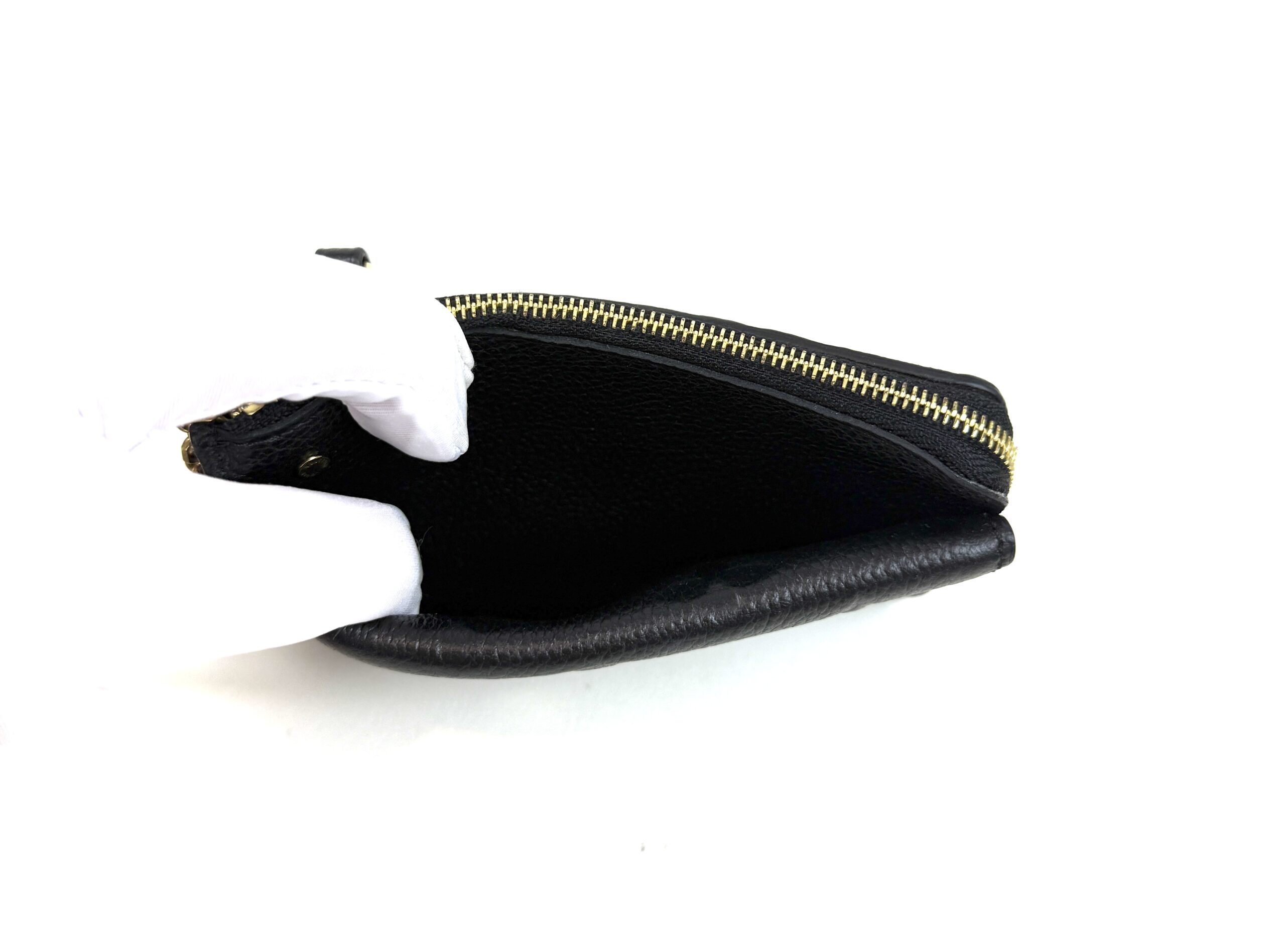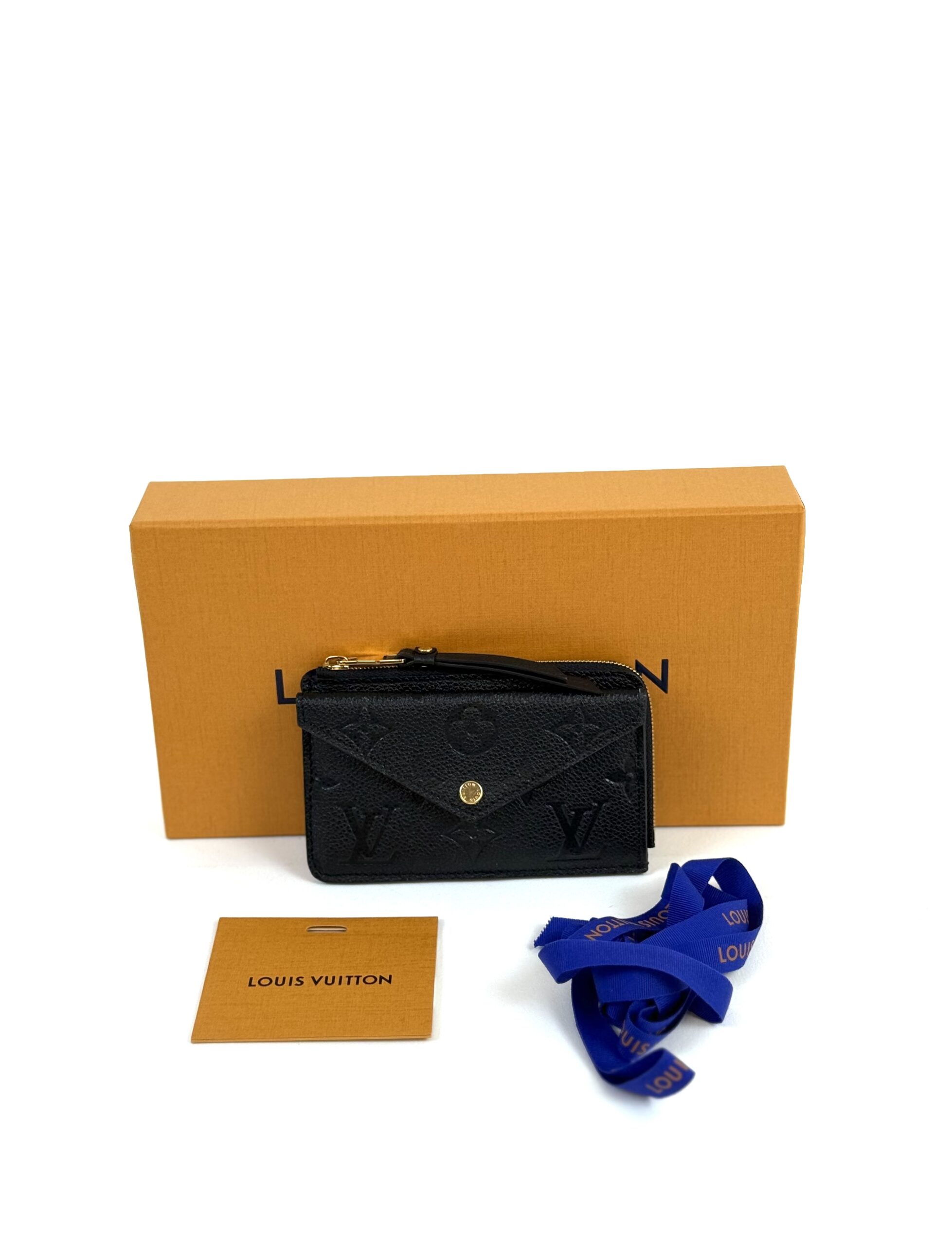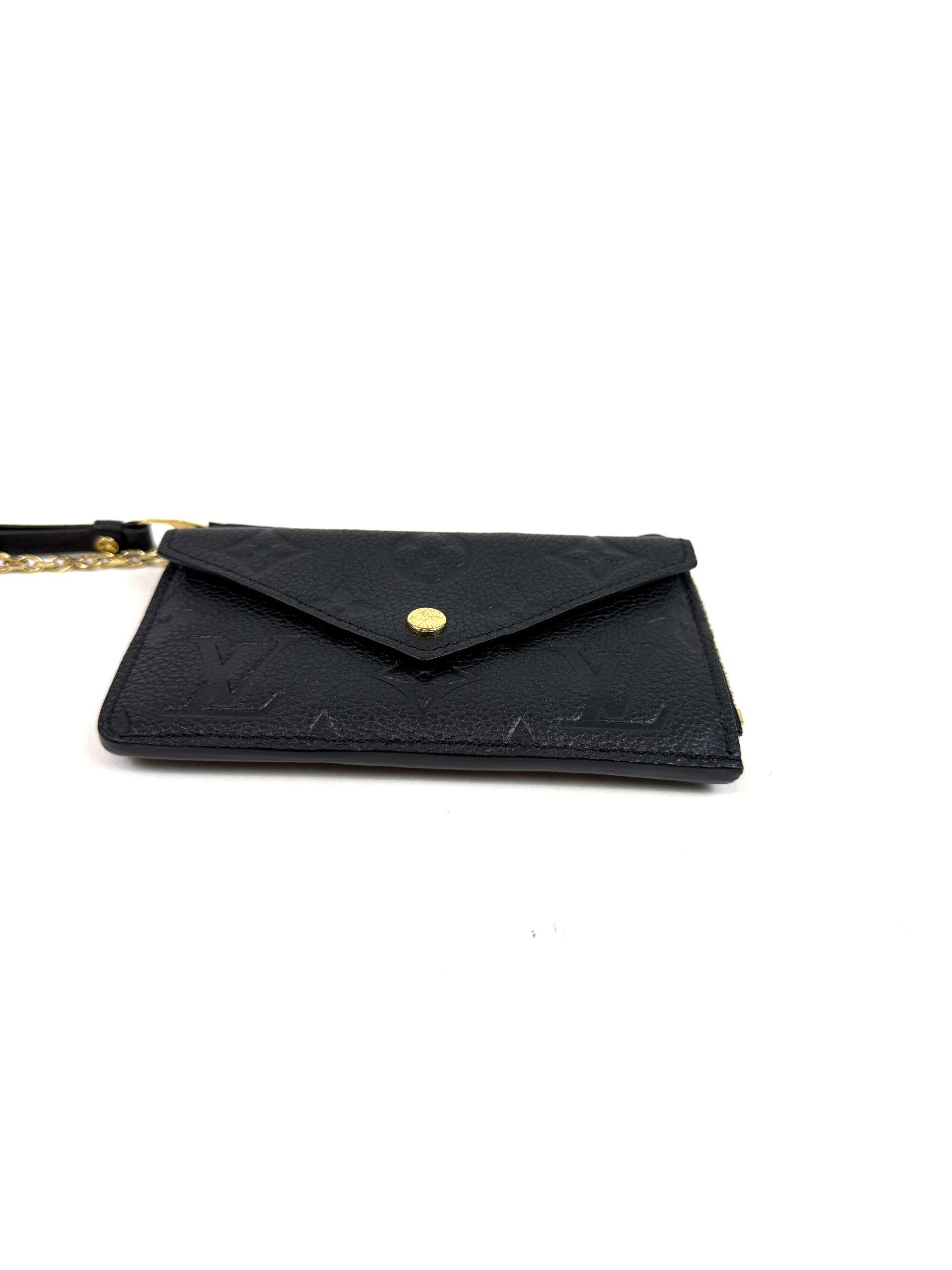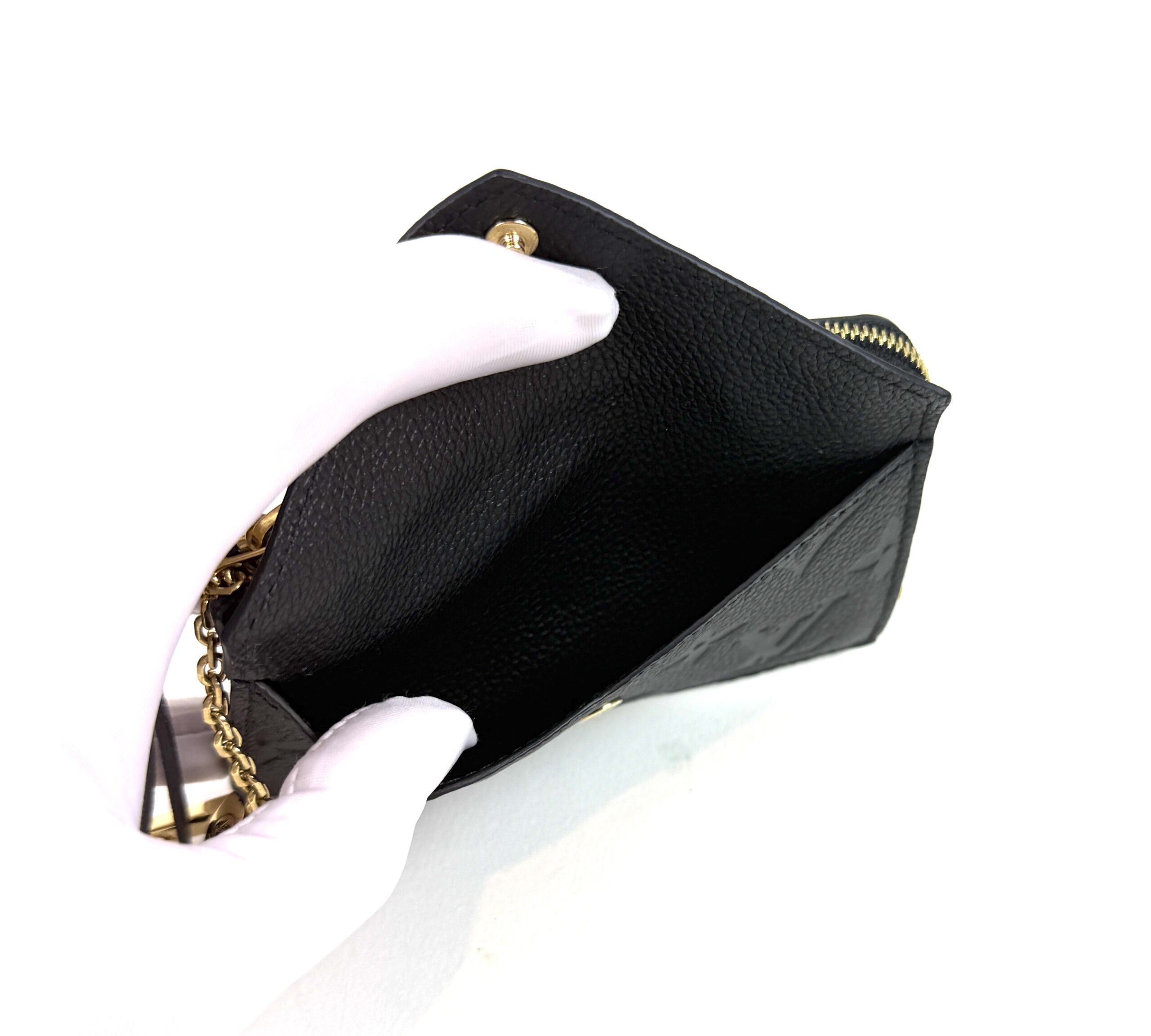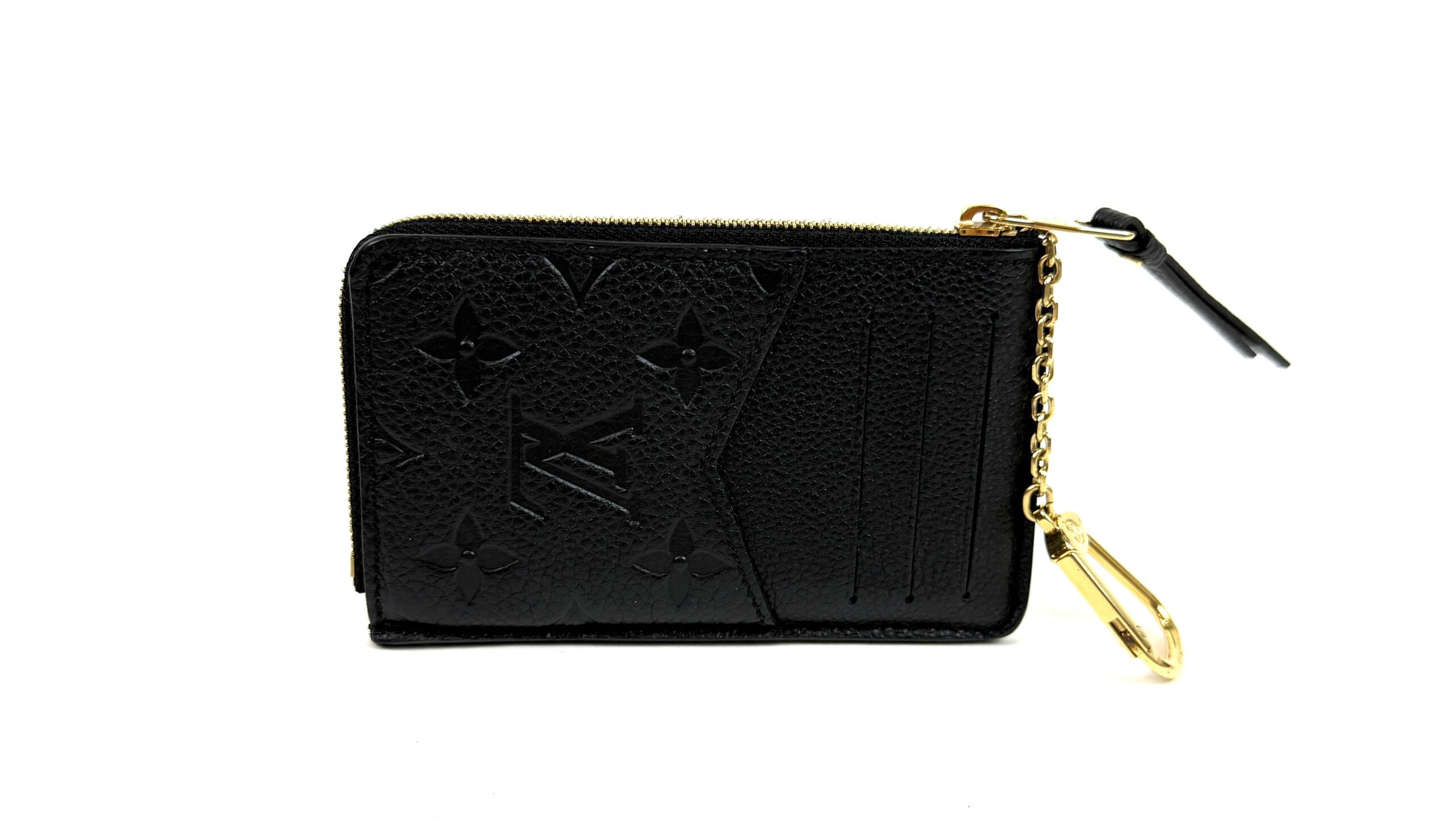 This very chic cardholder is finely crafted of Louis Vuitton monogram-embossed leather in black. The case features a front envelope pocket, card slots on the back, and a zipper currency compartment with a key ring clasp. Retail plus tax is $888!