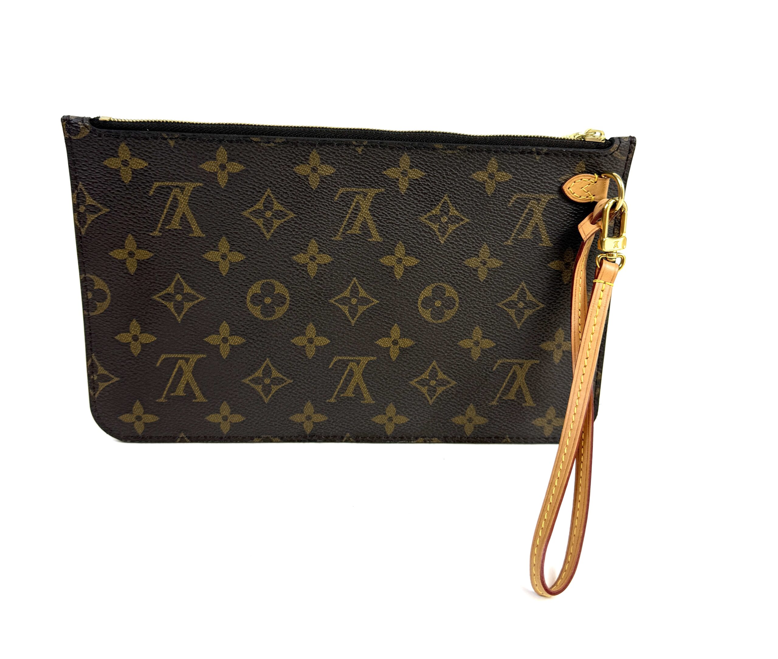 For those everyday essentials, this pouch is made of traditional Louis Vuitton monogram-coated canvas with polished gold hardware. The top zipper opens to a striped beige interior with a patch pocket.