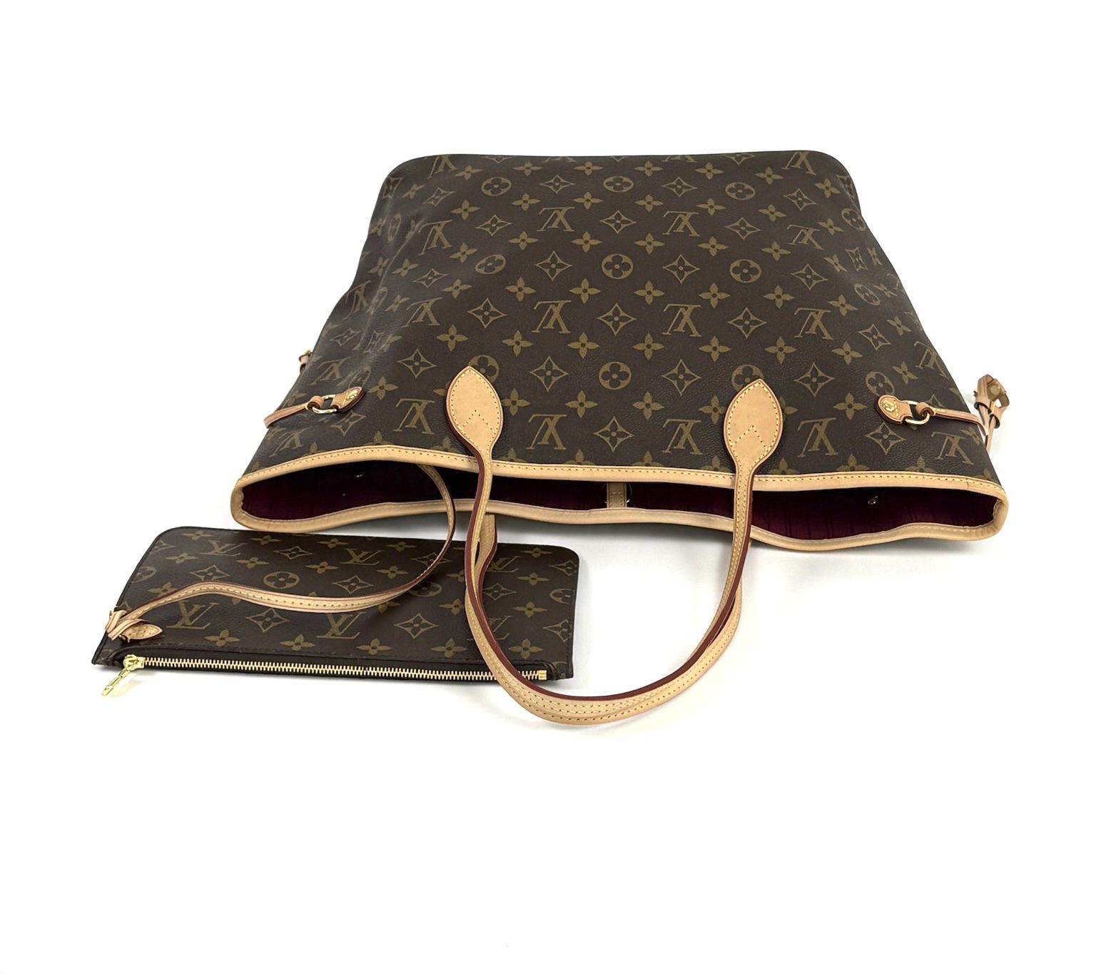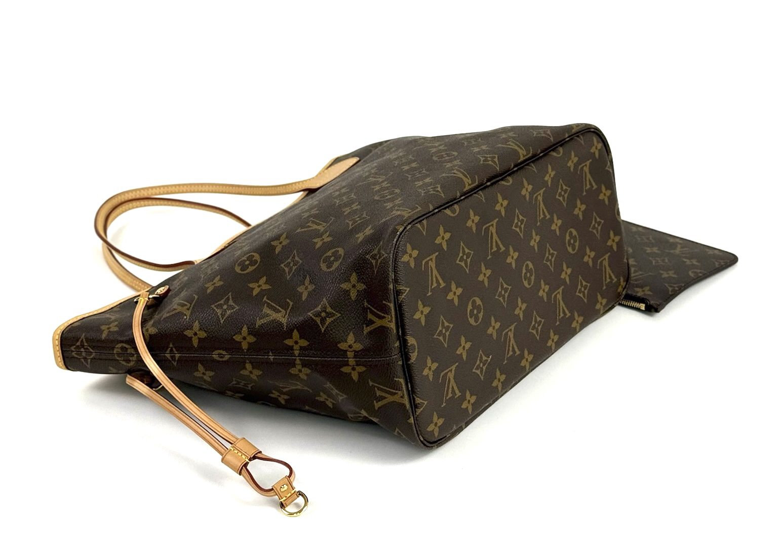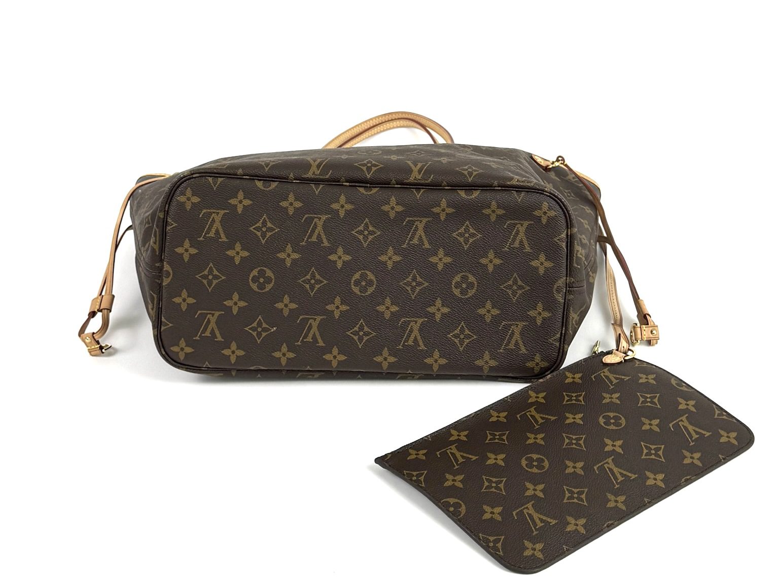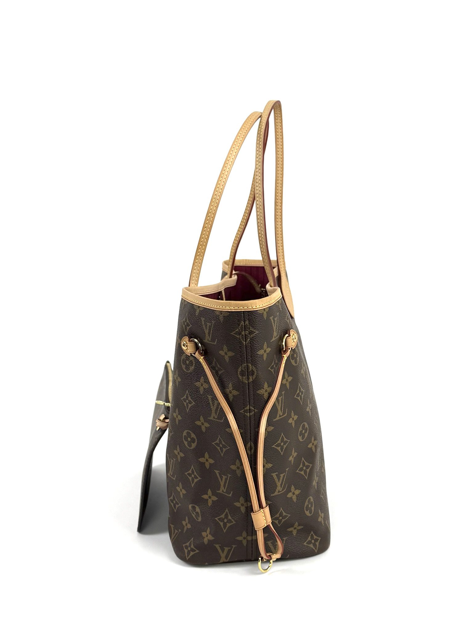 This stylish Neverfull is crafted of classic Louis Vuitton monogram on toile canvas. This shoulder bag features vachetta cowhide leather shoulder straps, trim, and side cinch cords with polished brass hardware. The wide top opens to a Pivoine fabric interior with a hanging pocket.