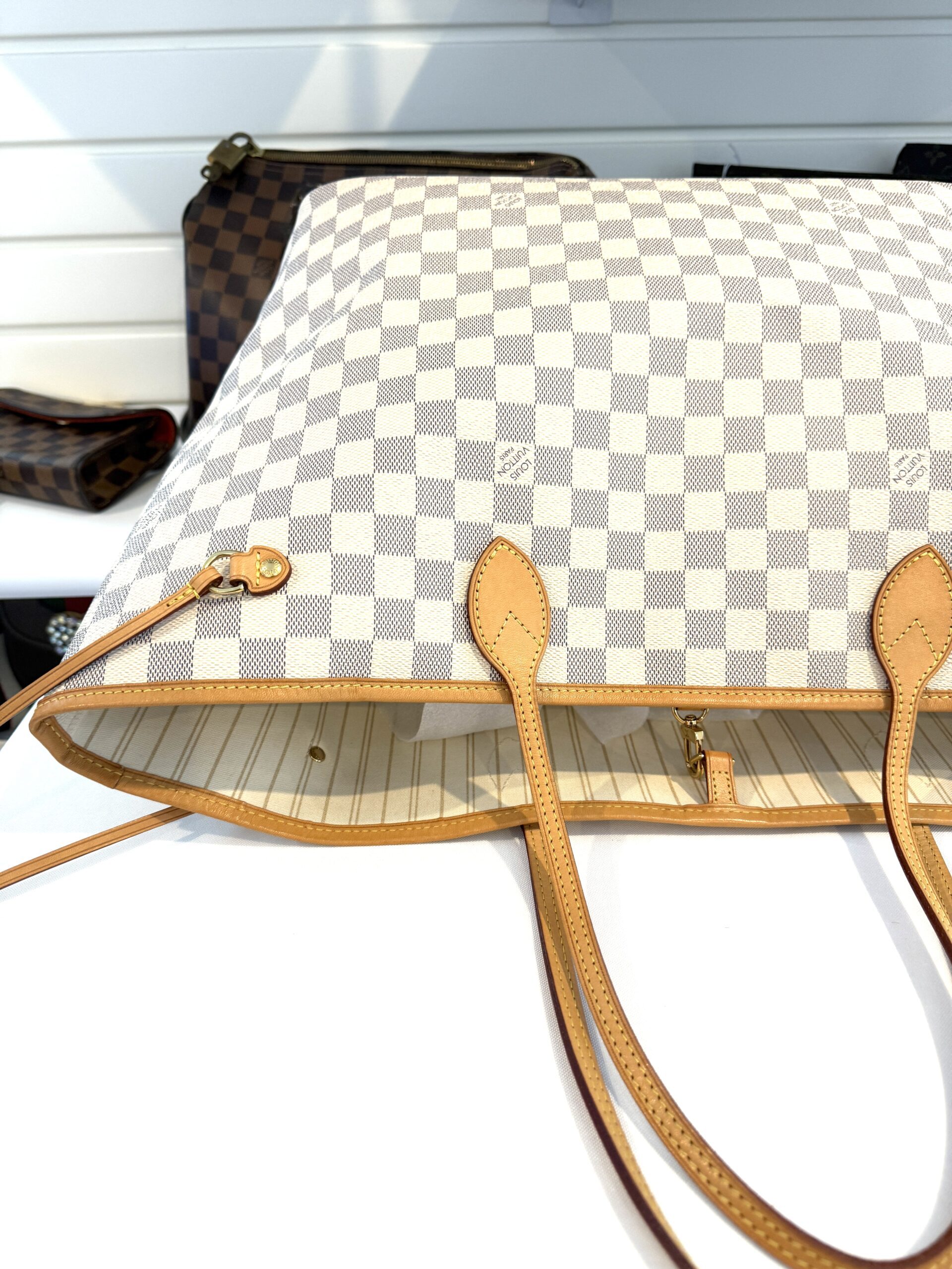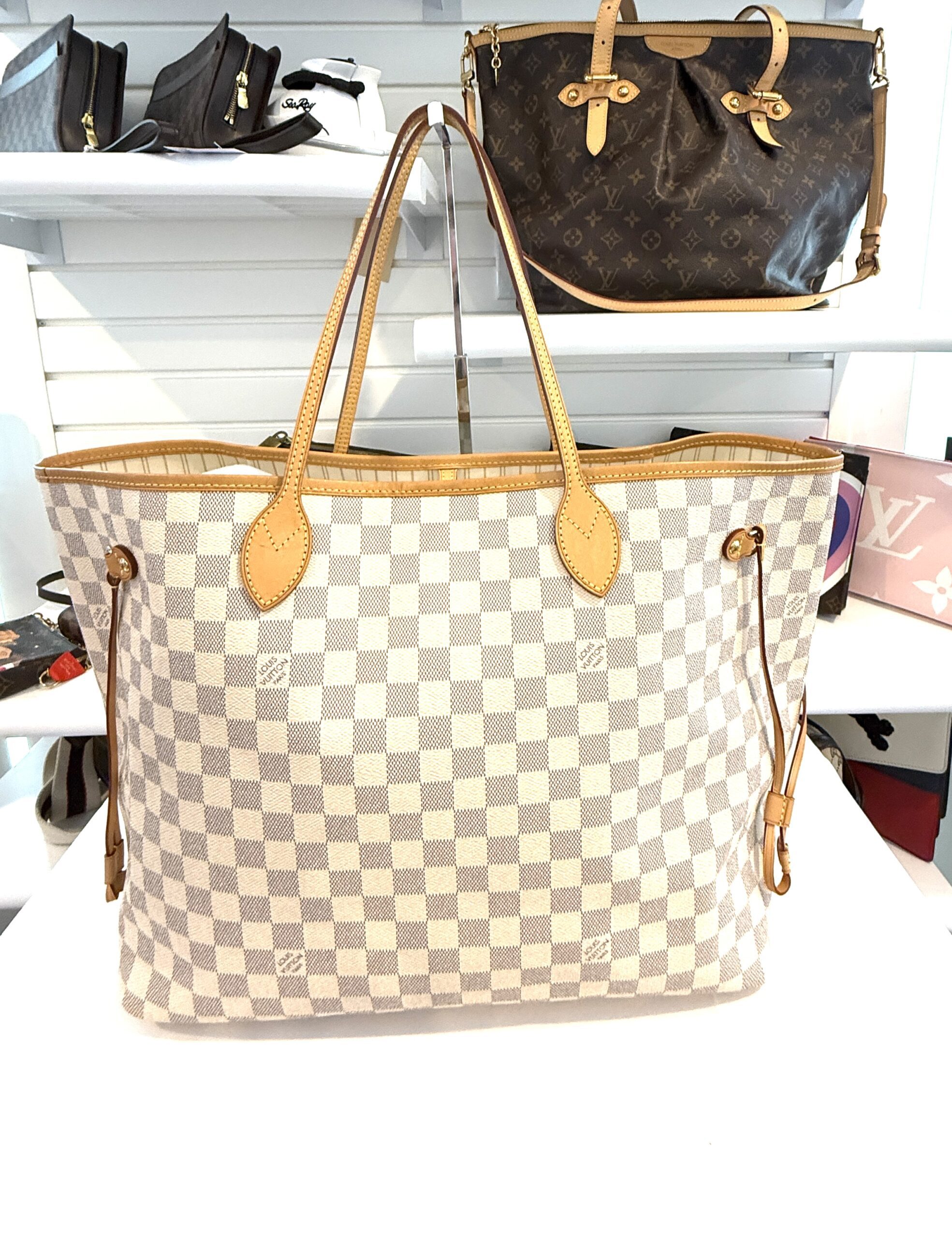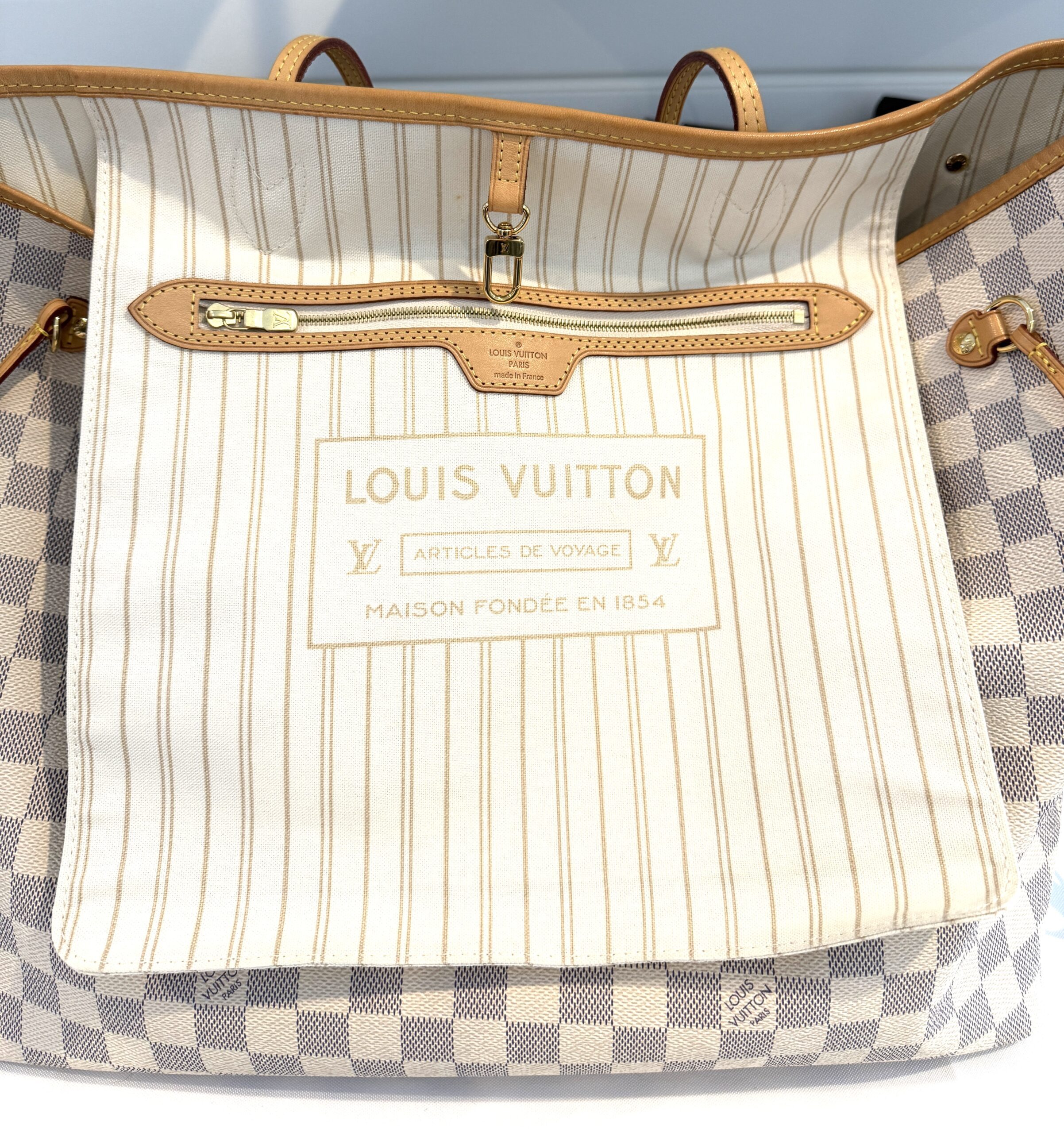 This chic tote is crafted of Louis Vuitton signature Damier in blue and white on coated canvas. The bag features vachetta cowhide leather trim, shoulder straps, and side cinches with polished gold tone hardware. The top is open to a striped fabric interior with a hanging pocket.