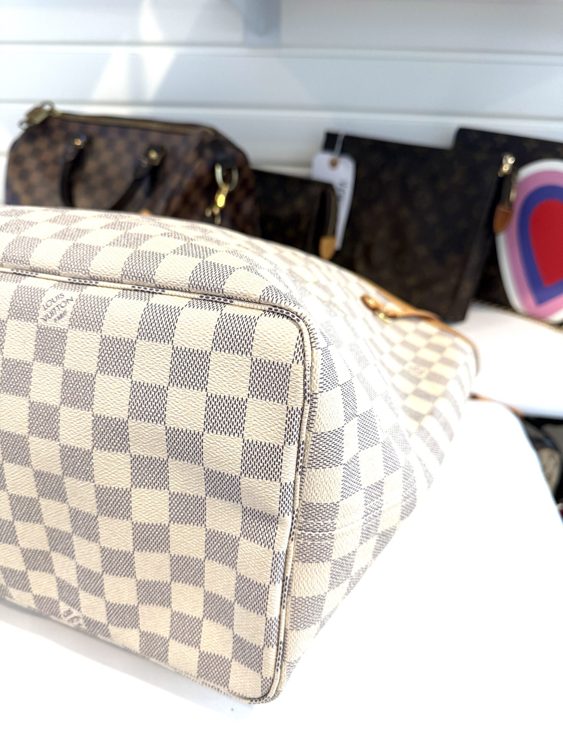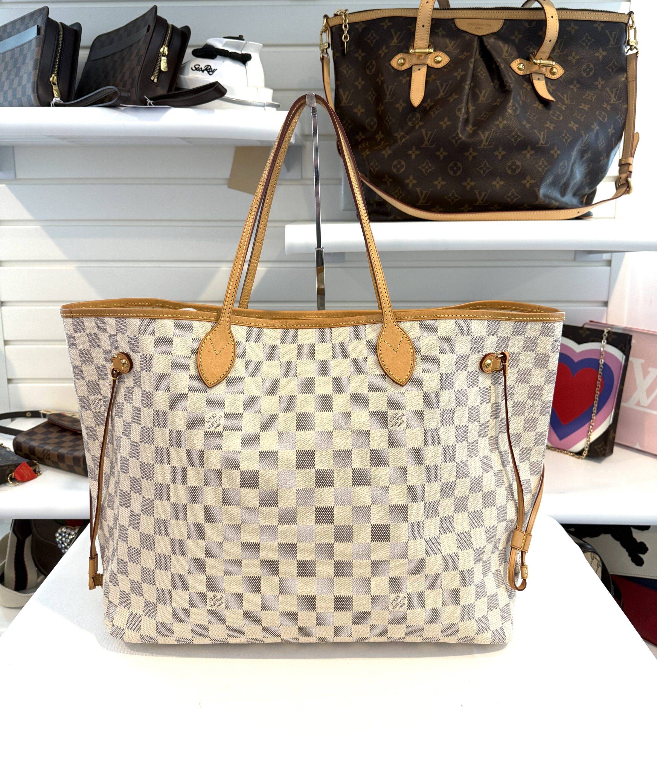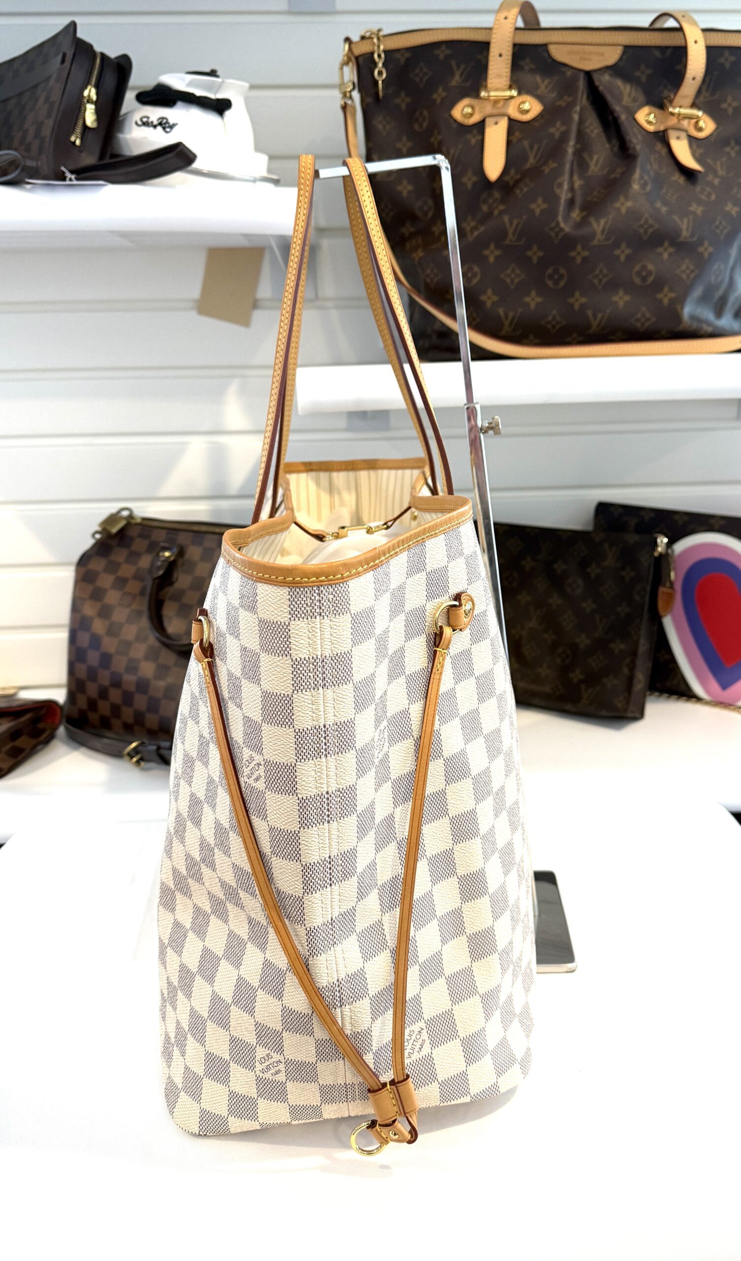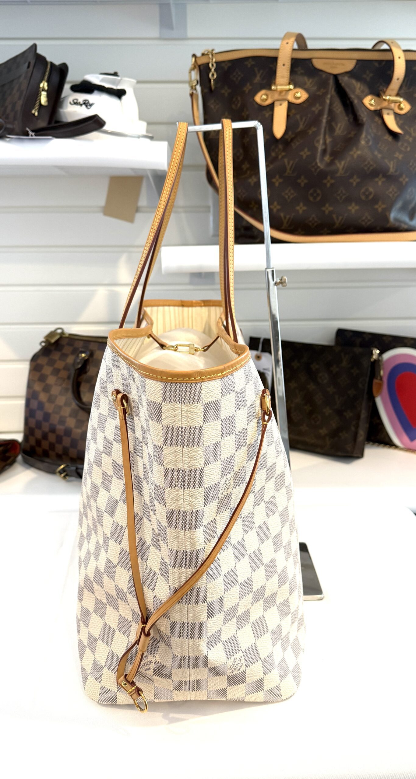 This chic tote is crafted of Louis Vuitton signature Damier in blue and white on coated canvas. The bag features vachetta cowhide leather trim, shoulder straps, and side cinches with polished gold tone hardware. The top is open to a striped fabric interior with a hanging pocket.