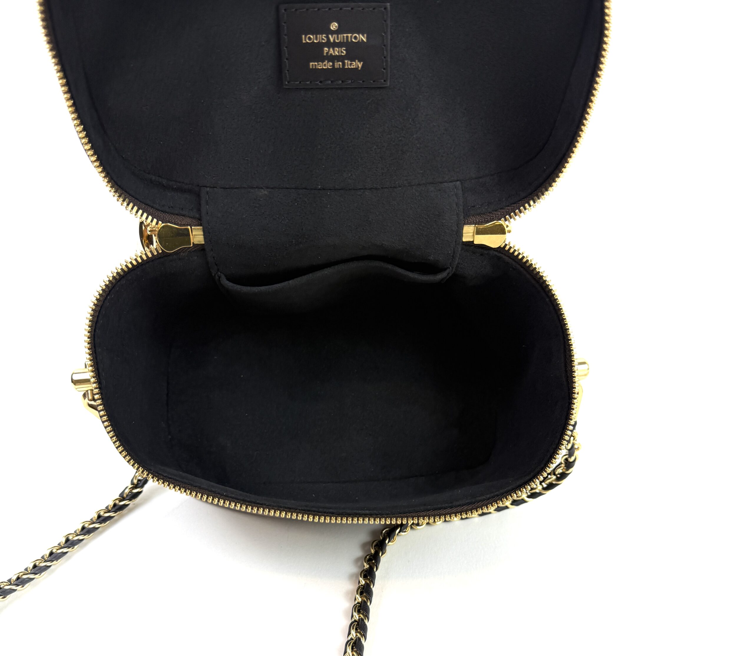 The case features a black leather top handle and piping trim, a braided leather-threaded gold chain strap, and gold-toned hardware. The top zipper opens to a black microfiber interior with a patch pocket. Retail plus tax $3488!